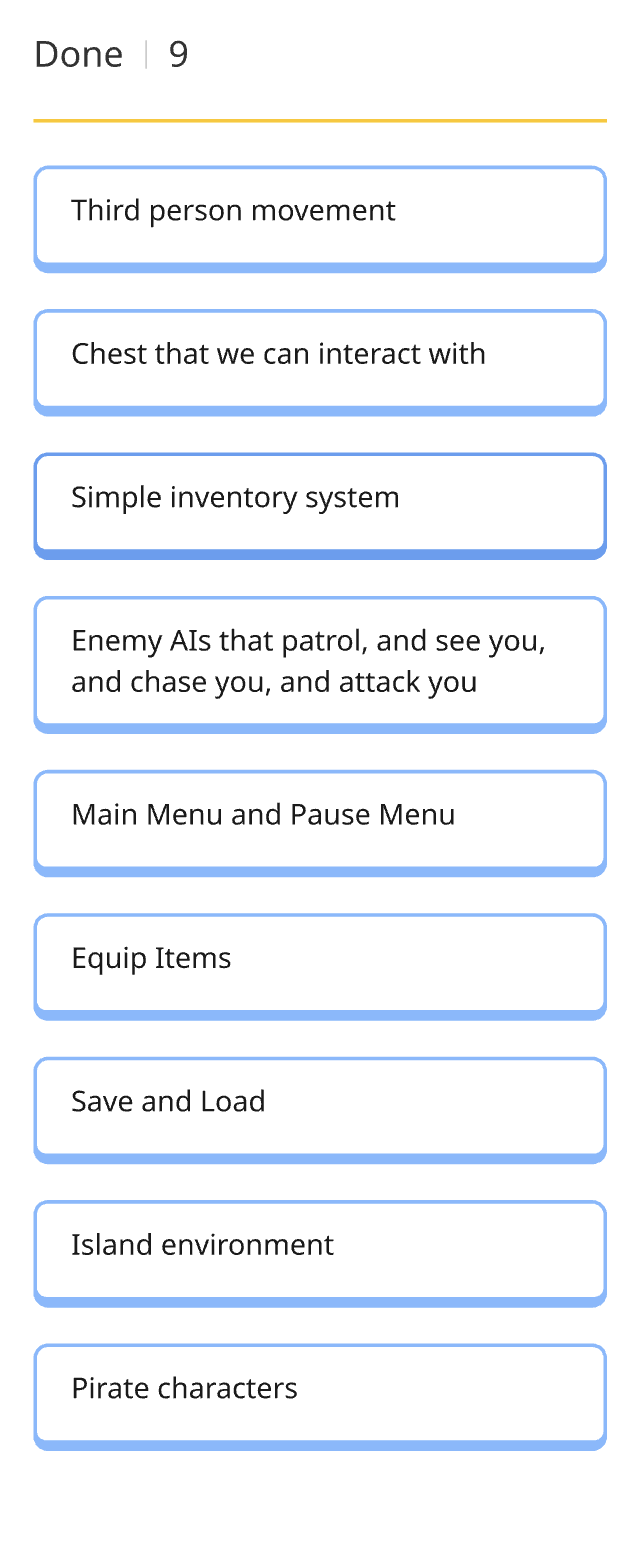 Set up patrolling enemy AIs that detect, chase and attack you, plus a main menu, pause menu, and save/load so it feels like a real game.